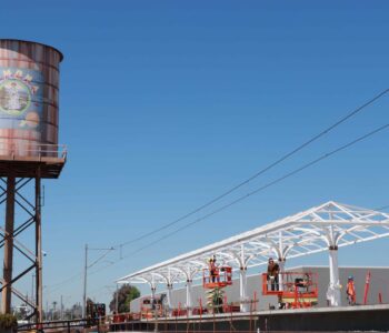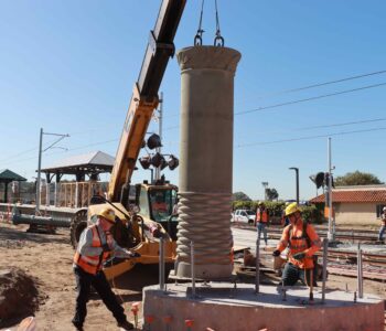 Crews are installing the canopy structures at the future Pomona station. It is the last set of station canopies to…